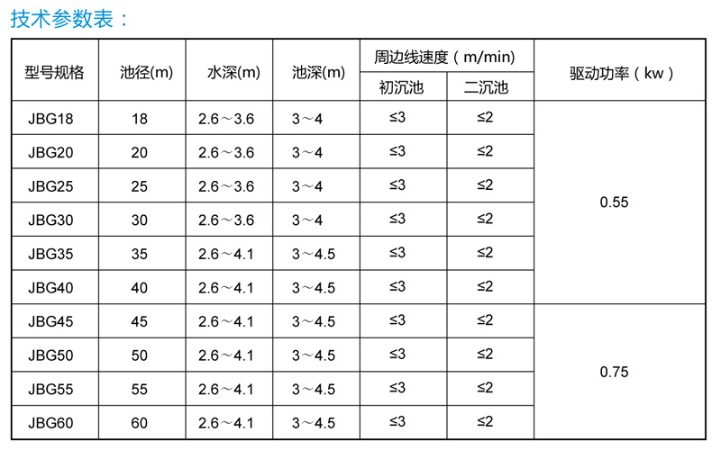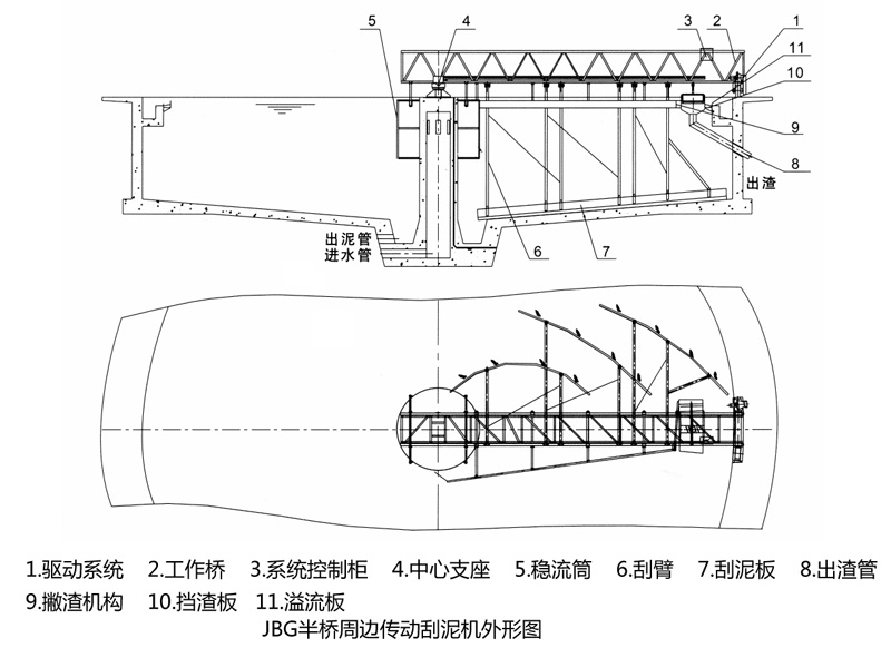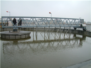 工作橋由安裝在周邊的驅動機構帶動,繞安裝在池中心支墩上的中心支座旋轉,安裝在工作橋的一組刮泥板在旋轉過程中,將沉降在池底的污泥刮向池中心的集泥坑。同時,液面上的浮渣在在浮渣刮板和周邊擋堰形成的漸縮區域內集中,由浮渣刮耙扒到集渣斗,排出池外。