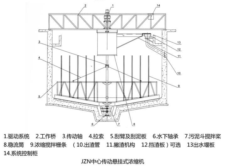 中心傳動垂架式濃縮機由工作橋(通常半橋)、驅動裝置(通常采用減速機、傳遞齒輪、回轉軸承組合)、旋轉垂架、刮臂及刮泥板、濃縮攪拌柵條、拉索、泥斗攪拌槳、穩流筒和電控柜等主件組成。根據實際情況和用戶的要求還可以提供出水堰板、撇渣機構、擋渣板和出渣斗等附件。